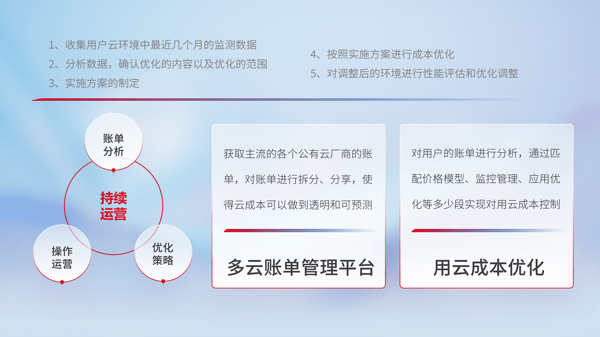 通过多云纳管,,,,以统一的资源数据模型把客户的云资源进行抽象和封装,,,进而实现对多云资源的统一操作,,,保障云资源管理的可靠性、、稳定性与可用性。。。量身定制化运维内容,,,,配置、、开发运维、、、补丁管理、、备份、、、监控、、、认证和访问管理、、审计和日常巡检等,,,保障在用云过程中的可靠度,,,,稳定度以及高可用率。。